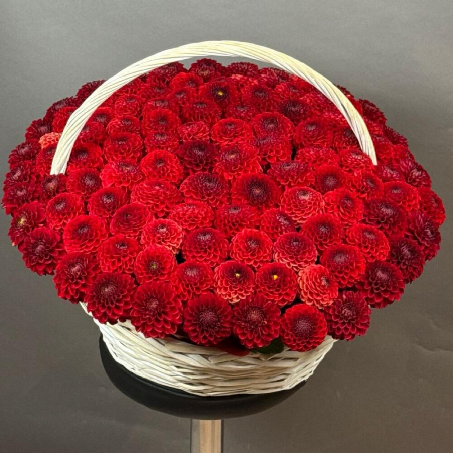 Композиция из 101 красной георгины в корзине в Егорьевске