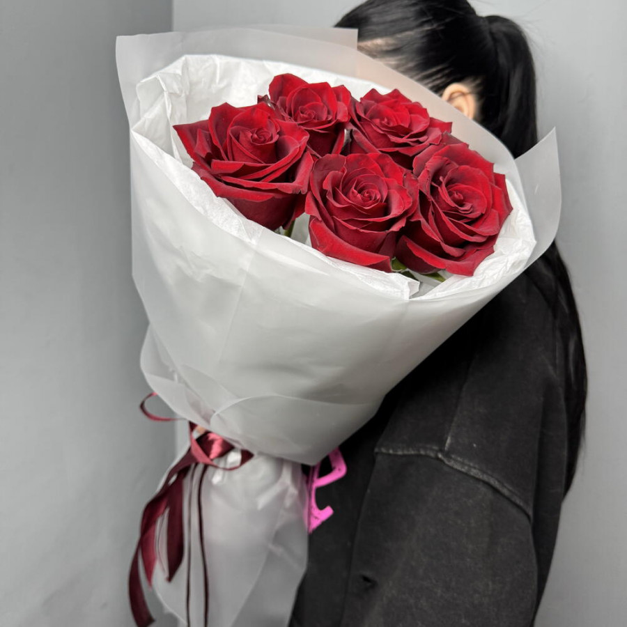 На фото букет из 5 бордовых роз. В составе: роза 5 шт, дизайнерская упаковка 1 шт, атласная лента 1 шт, . Все цветы свежие и ароматные, букет красиво оформлен и отлично подходит для подарка. Доступна доставка цветов или самовывоз.