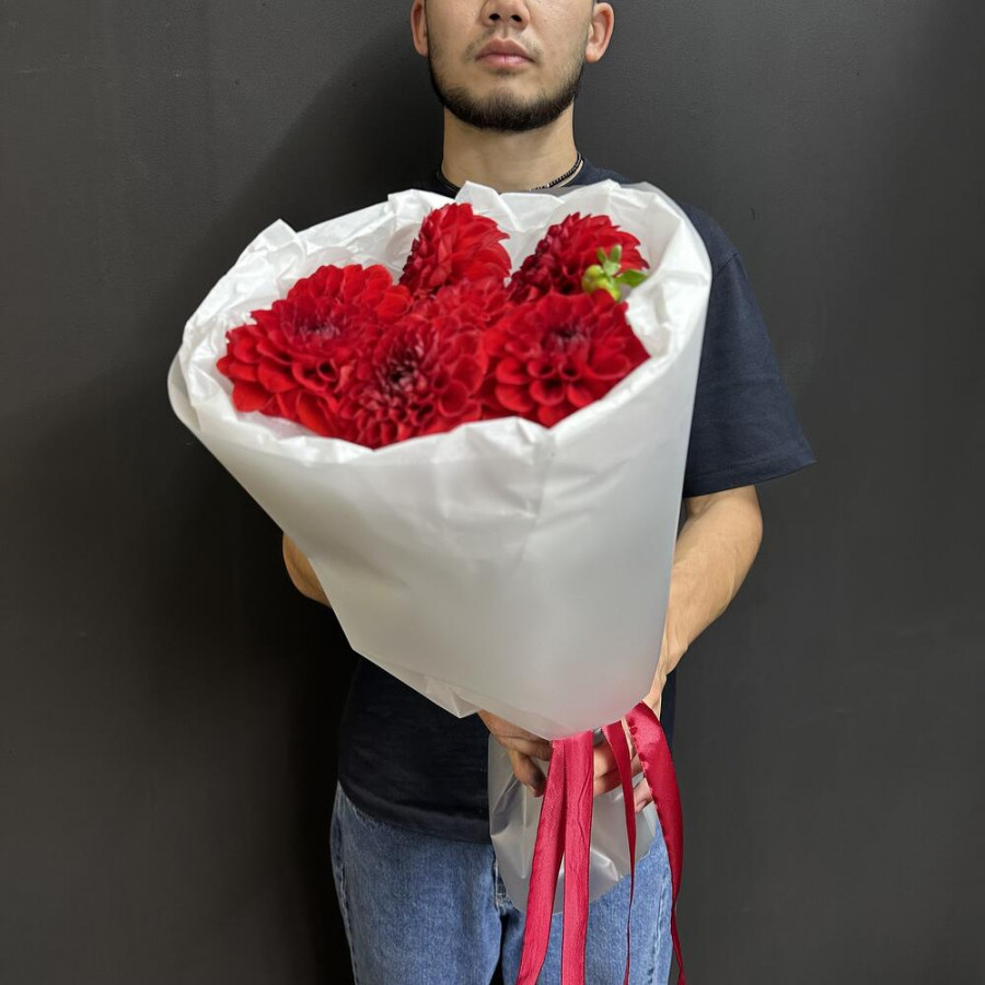 На фото букет из 7 красных георгин. В составе: георгина 7 шт, дизайнерская упаковка 2 шт, атласная лента 1 шт, . Все цветы свежие и ароматные, букет красиво оформлен и отлично подходит для подарка. Доступна доставка цветов или самовывоз.